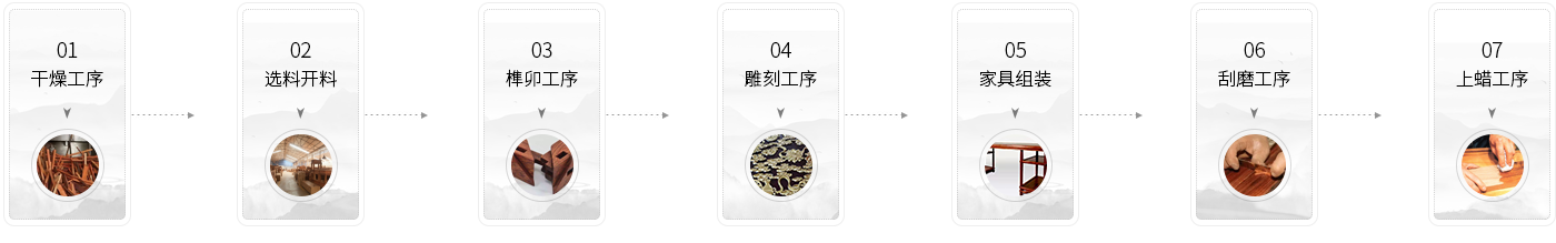 榫卯工序完成后,會進入到雕刻紋飾的工序,可以說紅木家具的全部工藝,雕刻工藝就占了一半以上。紅木家具中對手工雕刻的要求非常嚴格,在雕刻車間,每一名雕刻工在雕刻時都要集中精力,一旦刻錯一刀,整張木板就很難修補了,這對紅木家具成品的質量影響很大。紅木家具中木工工藝和雕刻工藝相結合,才能體現珠璧共輝、異曲同工的效果。